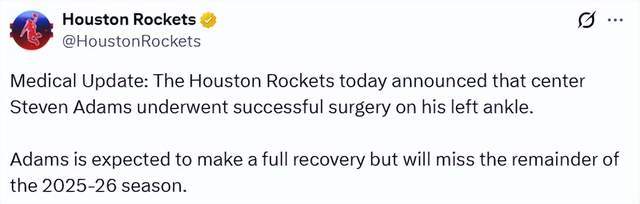 北京时间1月29日,据ESPN记者Shams报道,火箭队中锋史蒂文-亚当斯因左脚踝伤势接受手术,将缺席2025-26赛季剩余全部比赛。随后,火箭官方宣布了这一消息。亚当斯本人晒出术后病床照:一切都很顺利,感谢你们所有的关心和祈祷。